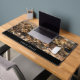 Stylish desk mat with a motivational quote "Energy flows where attention goes." combined with flowing water of a crystal clear creek as positive mindset desk mat design for elegant and modern offices.