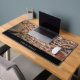 Stylish desk mat with a motivational quote "Energy flows where attention goes." combined with flowing water of a crystal clear creek as positive mindset desk mat design for elegant and modern offices.