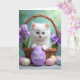 On the front of the card a fluffy snow-white kitten with bright blue eyes sits snugly in a rustic woven basket, gazing forward with a gentle, affectionate look that feels like a quiet hello between close friends. Its small paws rest on a smooth lavender egg centred in the basket, and the egg carries a short “first” milestone message in neat lettering. Around the kitten, purple tulips and soft bows tuck into the weave, adding springtime colour and a tender, romantic touch like a bouquet placed just for someone special 🌷. The lighting is soft and diffused, giving the fur a glowing edge and keeping the scene calm and cosy. Behind the basket, the background fades into a blurred wash of teal and fresh greens, suggesting an outdoor garden without showing any sharp details. In the lower area, several pastel eggs are scattered across the foreground, some decorated with tiny star shapes and others marked with fine crack-like patterns that look carefully drawn. The greeting text sits above the main image in a light purple tone, while the “first” message appears on the lavender egg near the centre 🐰.