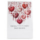 A Valentine's Day themed digital illustration with multiple hanging heart decorations in varying shades of red, pink, and burgundy. The hearts are textured with a soft, furry appearance and decorated with small white and pink flowers, delicate leaves, and vine-like branches that extend downward. The hearts are suspended from thin threads against a white background. The composition includes small floating hearts in the lower portion. The leaves and vines are rendered in deep red and burgundy tones, creating a cohesive color palette. The flowers are simple botanical designs with 4-5 petals each. The hearts vary in size, with larger hearts positioned in the center and smaller ones scattered throughout the design. The overall arrangement creates a flowing, decorative pattern that draws the eye downward. The illustration has a clean, modern artistic style with smooth gradients and careful attention to the interplay between the hanging hearts and their decorative elements.