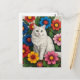 White fluffy cat sitting in a patch of colourful folk art flowers. Cute cat themed greeting postcard for cat lovers to say hi to friends or family members.