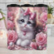 Fluffy White Kitten Pink Roses Thermal Tumbler