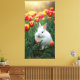 fluffy white rabbit sits among the tulips in full bloom in the sun