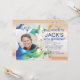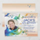 Ripples of fluid colour flow across the invitation consisting of blues and greens and turning to taupe and greys. A circular photo window is in the centre. Suitable for any age.