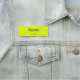 Name tag in fluorescent yellow ( #DFFF00 )solid colour background and grey fonts .Bold and trendy design by Alma Wad .