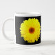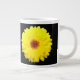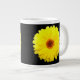 This awesome mug features a photo of a pretty fluorescent yellow marigold flower on a black background.