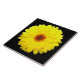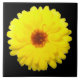 This awesome tile features a photo of a pretty fluorescent yellow marigold flower on a black background.