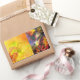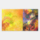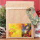 Colourful ,whimsical and vibrant watercolor painting in bright red,brown,yellow,orange,green colours with gold and silver foil .