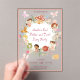 A unique acrylic invitation with whimsical hand-painted watercolor floral wreath, fairies, mushroom house, and woodland animals make for a fun Fairy Garden Flutter and Twirl Birthday celebration. Easily change the details to your own. You can edit further to change the font style, colour, size and placement too.