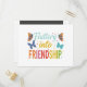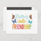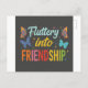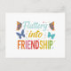 A vibrant Invitation postcard design with the text "Flutter into Friendship" in a rainbow of colours, with each letter a different hue. The playful text is sure to catch the eye and spread positive vibes.