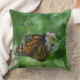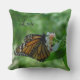 Pretty Monarch butterfly with its orange and black wings and white dots sitting on pink/white Geranium flowers. The word Love is written in black text on front of square throw pillow. Original Photography © TamiraZDesigns.