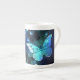 Fabulous, glowing, blue and yellow, night butterfly on dark background.