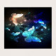 Fabulous, glowing, blue and yellow, night butterfly on dark background.
