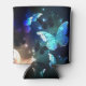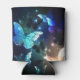 Fabulous, glowing, blue and yellow, night butterfly on dark background.