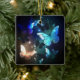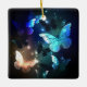 Fabulous, glowing, blue and yellow, night butterfly on dark background.