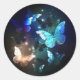 Fabulous, glowing, blue and yellow, night butterfly on dark background.