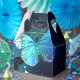 Fabulous, glowing, blue and yellow, night butterfly on dark background.