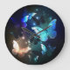 Fabulous, glowing, blue and yellow, night butterfly on dark background.