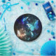 Fabulous, glowing, blue and yellow, night butterfly on dark background.
