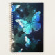 Fabulous, glowing, blue and yellow, night butterfly on dark background.