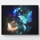 Fabulous, glowing, blue and yellow, night butterfly on dark background.
