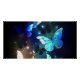 Fabulous, glowing, blue and yellow, night butterfly on dark background.