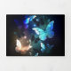 Fabulous, glowing, blue and yellow, night butterfly on dark background.