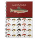 Notebook Fly Fishing Flies Rustic Salmon Watercolor design. This design is great for gifts for fishermen. Perfect for mountain Lake stream or ocean home or vacation rental properties. Vintage Catalogue painting by Mary Orvis
