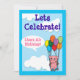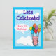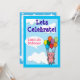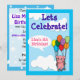 A lovely children's birthday invitation featuring a digital illustration of pink pig using a bunch of multicoloured balloons to fly high into the cloudy blue sky. Please customise all the details to make the invitation truly your own.