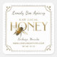 Dotted border with ornate frame with a realistic honeybee in flight and word "HONEY" printed in a metallic gold gradient.