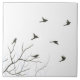Birds in flight are one of nature's most beautiful sights. These birds are taking off from black silhouetted treetops, which fade to misty blue in the background. This peaceful image and its delicate hint of colour would add a lovely touch of nature to your world.