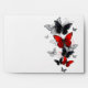 Flock of flying, realistic, red and black morpho butterflies on white background with drops of paint.