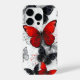 Flock of flying, realistic, red and black morpho butterflies on white background with drops of paint.