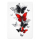 Flock of flying, realistic, red and black morpho butterflies on white background with drops of paint.