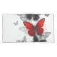 Flock of flying, realistic, red and black morpho butterflies on white background with drops of paint.