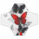Flock of flying, realistic, red and black morpho butterflies on white background with drops of paint.