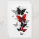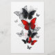 Flock of flying, realistic, red and black morpho butterflies on white background with drops of paint.