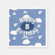 This whimsical paper napkin for a boy's or girl's birthday party features various illustrated folded white paper aeroplanes with dashed-line flight trails amongst puffy white clouds on a customisable blue background - personalise with your child's name & age - by katz_d_zynes