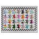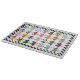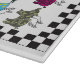 This glass cutting board shows silly flying pigs edged with a black and white chequerboard border.