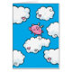 A black greetings card template featuring an adorable digital cartoon pink pig with little white wings, dancing on clouds embellished with hearts up in the bright blue sky. Add your own message on the inside to make it any occasion!
