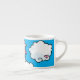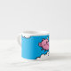 An espresso mug featuring a digital cartoon pink pig with little white wings, dances on clouds embellished with hearts up in the bright blue sky.