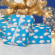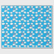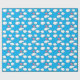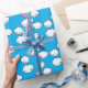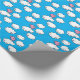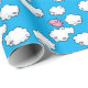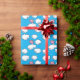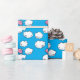 Wrapping paper featuring a repeating pattern of a digital cartoon pink pig with little white wings, dances on clouds embellished with hearts up in the bright blue sky