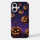 Whimsical Halloween design of tiny flying jack-o’-lanterns soaring through a purple night sky. Perfect magical and fun spooky artwork.