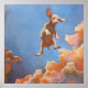Square poster with a painting of a puppy flying in a blue sky with clouds. This is a gift to make someone smile. Great for a kid's room or medical waiting room.