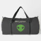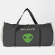 A black & light brown duffle bag for those who believe or science fiction fan. It is decorated with a green alien, a flying saucer and a customisable message "Believe"! Perfect gift for a geek!
