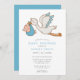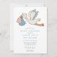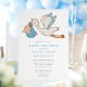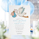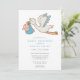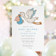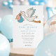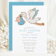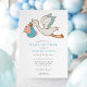 Celebrate the arrival of a little one with this delightful flying stork baby shower invitation. Featuring a modern illustration of a stork carrying a baby boy in a blue bundle, this invitation is perfect for a classic baby shower theme. The whimsical design and charming colours make it a lovely choice for parents expecting a baby boy, adding a playful touch to the special event.