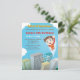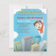 A cute and colourful kids birthday party invitation for that superhero themed birthday party! The design is from a bird eye's view perspective with a cute superhero boy in red and yellow superhero outfit flying high above the city landscape of tall buildings and going towards the clouds! Personalise easily with your party details including the letter initial on the boy's hero outfit.