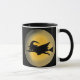 Ceramic Coffee Tea Cup Mug beverage drinking accessory printed with Flying Wicked Witch Silhouette By TheFabricSeal is a scary looking sorceress with her flying witch broom and her pointed conical shaped witch hat as she quickly streaks through the dark of night sky and passing in front of the full yellow Halloween moon.