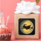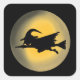 Decal Stickers printed with a Flying Wicked Witch Silhouette By TheFabricSeal is a scary looking sorceress with her flying witch broom and her pointed conical shaped witch hat as she quickly streaks through the dark of night sky and passing in front of the full yellow Halloween moon.