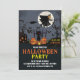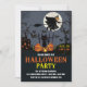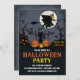 The Halloween Party Invitation features a haunted house, bats, a witch on a broomstick, scary jack-o-lanterns, an eerie cat and creepy trees. You can move/delete/change most of the design elements/fonts/background according to your choice/preferences by clicking on the 'Customise' button.